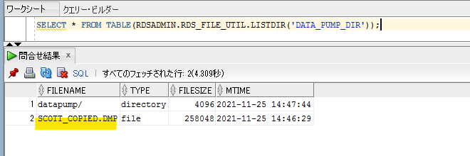 SELECT * FROM TABLE(RDSADMIN.RDS_FILE_UTIL.LISTDIR('DATA_PUMP_DIR'));