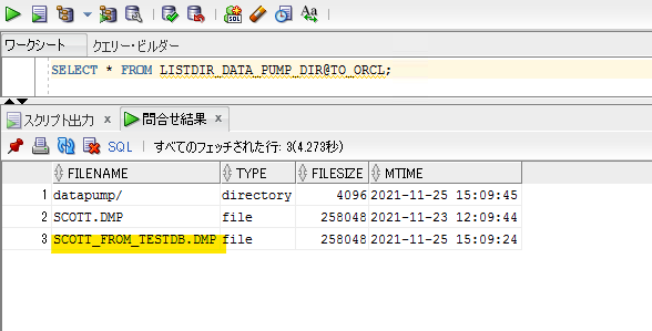 次に テスト環境 (データベース名:TESTDB) から、データベースリンク越しに本番環境(データベース名:ORCL)の DATA_PUMP_DIR ディレクトリに存在するファイルのリストを確認してみます。