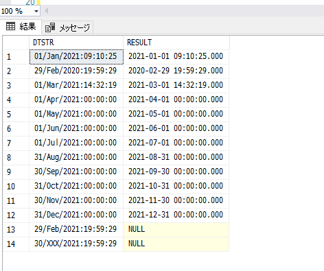 月と年を入れ替えてしまえば、「月名称の変換表を取得する」で紹介した変換表で月名称を数値に変換して、あとは CONVERT に任せます。TRY_CONVERT を利用していますので、変換に失敗した場合は NULL が返ります。テストしてみます。