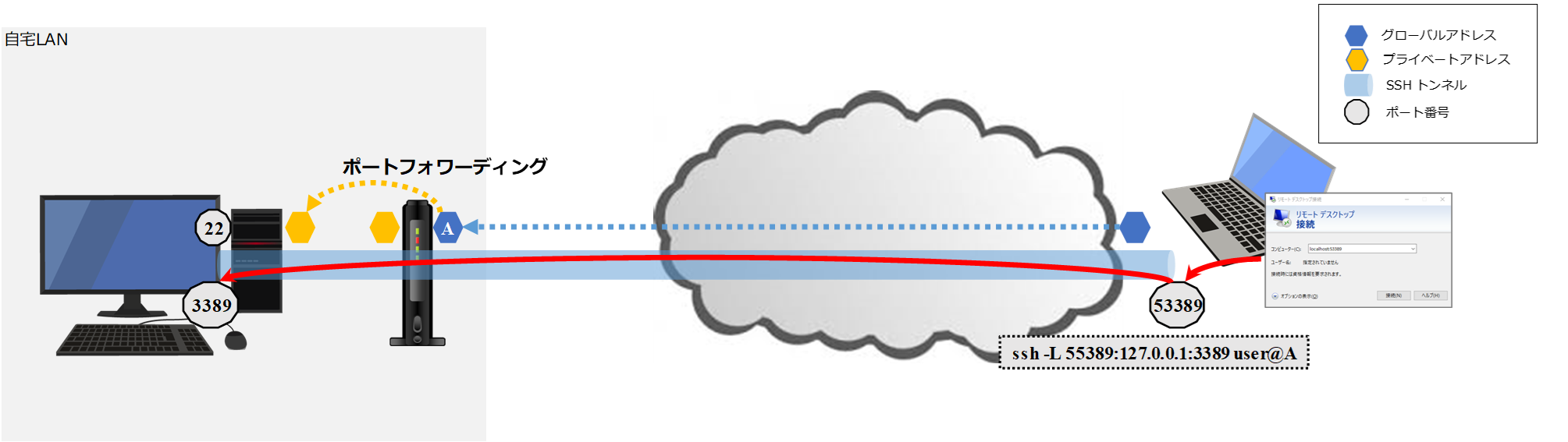 「自宅 PC に外からアクセスしたい」とかは、意外と普通にある欲求のようで Google 先生にも多数の情報にぶつかります。自宅にあるインターネット回線につないでいるルーター(市販の Wi-Fi ルーターをつないでるひとが多いでしょう)には大抵は「ポートフォワーディング」の機能がついており、外からのアクセスを内側(つまり自宅 PC 側)へ流すような設定ができます。最近では、Windows でも SSH サーバーが簡単に設定できるので、「SSH ポートフォワーディングでリモートデスクトップ接続」に書いたようなセキュアなアクセスは標準機能だけでできてしまいます。図で書くと以下のような感じですね。