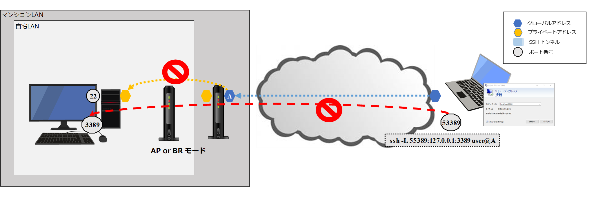 しかし、冒頭に書いたようにマンションのような集合住宅の共有回線ですとそうはいきません。共有回線の場合はいわゆる「2重ルーター問題」を回避するために、自宅ルーターは AP モード とか BR モードにするんですが、それってつまり、マンション共同のルータに対して先のポートフォワーディング設定をやらないとダメってことになるわけです。図で言うと以下のような感じです。そんなの許さるわけがありませんね。
