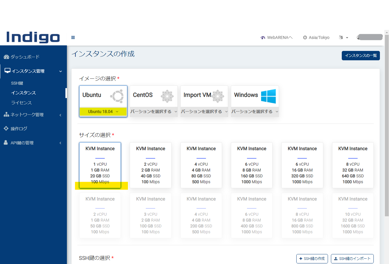 契約後、最安の「1 vCPU, 1GB RAM, 20 GB SSD, 100 Mbps」を「Ubuntu 18.04」で作成しました。