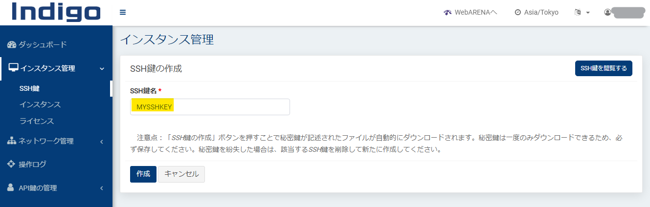 インスタンスには、必ず SSH 鍵が紐づいている必要があります。初めてインスタンスを作成する場合は「SSH鍵の作成」ボタンで「SSH鍵名」を入力することで SSH 鍵が作成されます。秘密鍵は private_key.txt というファイル名で自動でダウンロードされます。