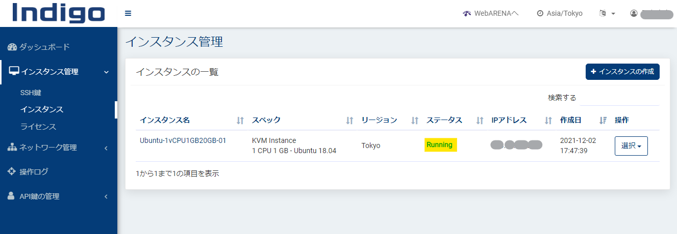 以下のようにステータスが「Running」になれば完成です。IP アドレス欄が外からアクセスするためのグローバルアドレスですね。