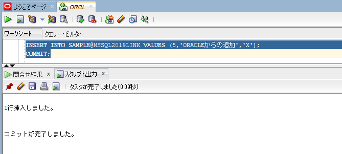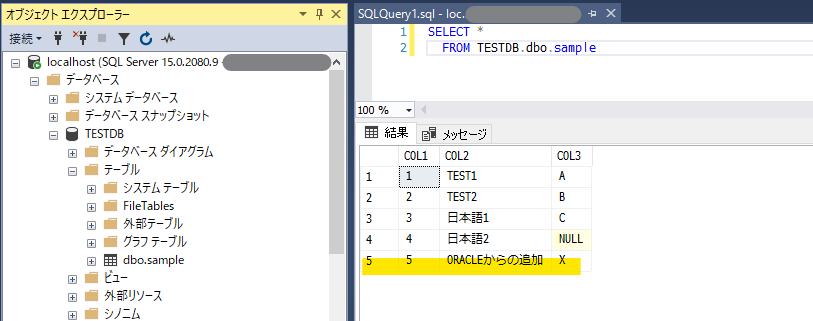 これで準備完了です。実際に Oracle から SQL Server に接続して sample テーブルを参照してみます。