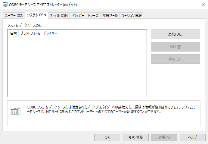 スタートメニューより「ODBC データソース (64 ビット)」を起動し、「システム DSN」タブを選択します。