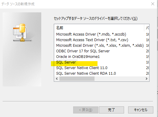 ここにデータソースを追加していきます。ドライバは、SQL Server に接続できれば良いのですが、とりあえず「SQL Server」を選択します。