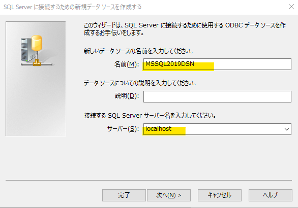 名前とサーバーを入力します。今回は同居なのでサーバーは localhost です。データソースの名前は「MSSQL2019DSN」とします。