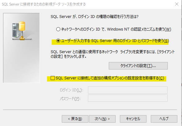 IDとパスワードは、Oracle側から設定しますので「ユーザーが入力する~」を選択し、「SQL Server に接続して~」のチェックボックスは外します。