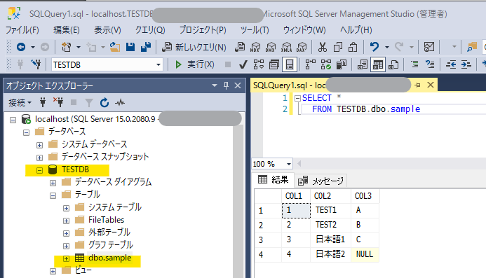 尚、SQL Server 上にはあらかじめ「TESTDB」というデータベースに sample というテーブルを作成しています。中身は以下の通りです。
