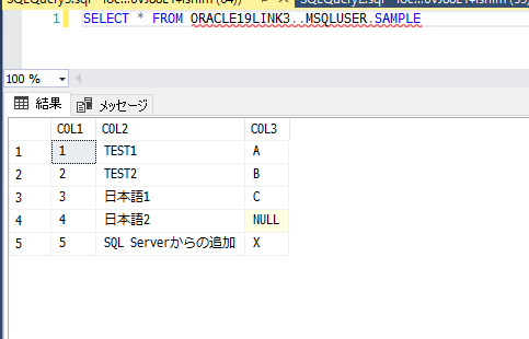 では、新しいリンクサーバー経由で、テストデータを参照してみます。OPENQUERY を利用せずに見てみます。