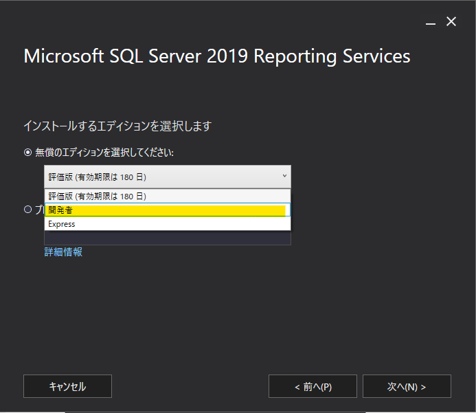 SQL Server を購入しているなら、そのプロダクトキーを開発者ライセンスで行う場合は以下のように「開発者」を選択します。