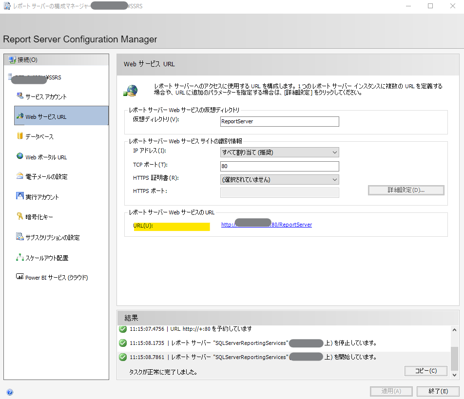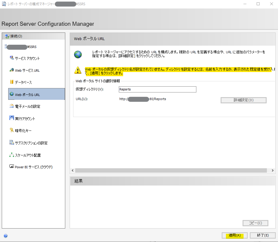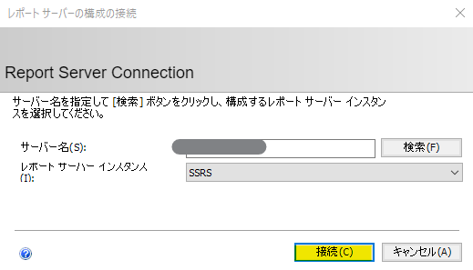 最初にインストールしたレポートサーバーへ接続します。初めてならばインストール後に引き続き実施しているので、自身のマシンがレポートサーバーだと思います。複数インスタンスや、別マシンのレポートサーバーに対する構成変更もできるってことでしょうね。