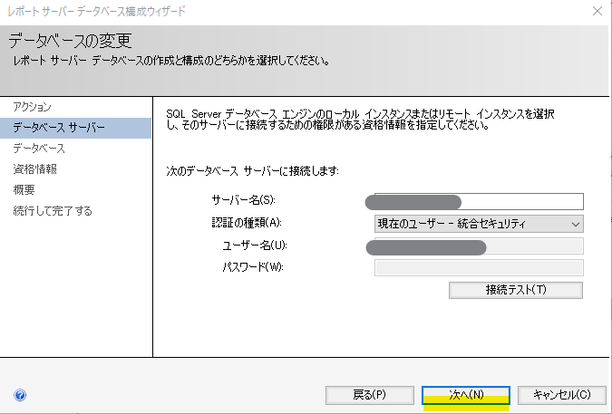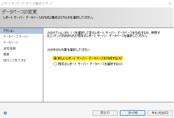 初めてなので「新しいレポートサーバーデータベースを作成する」を選択します。