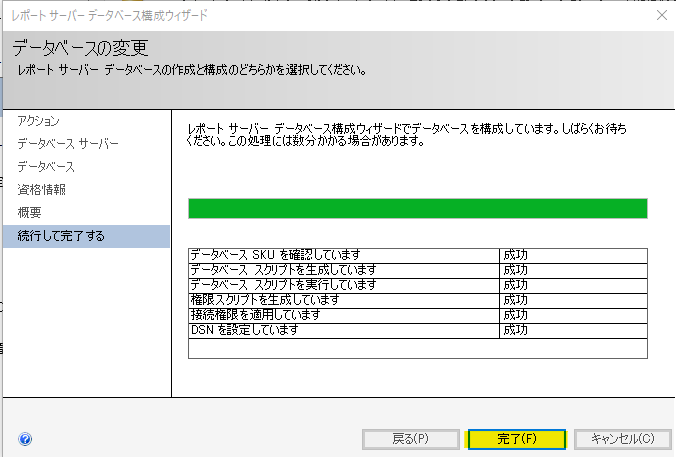 続けると、データベースの作成を開始しますので「完了」ボタンを選択します。
