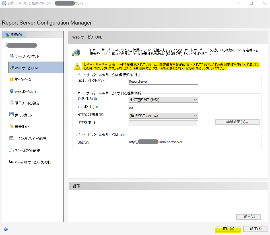 次に「Web サービスURL」を構成します。Web サービスなので、これはプログラムから呼び出して利用するためのサイトです。デフォルトで良いので、そのまま「適用」ボタンを選択してください。