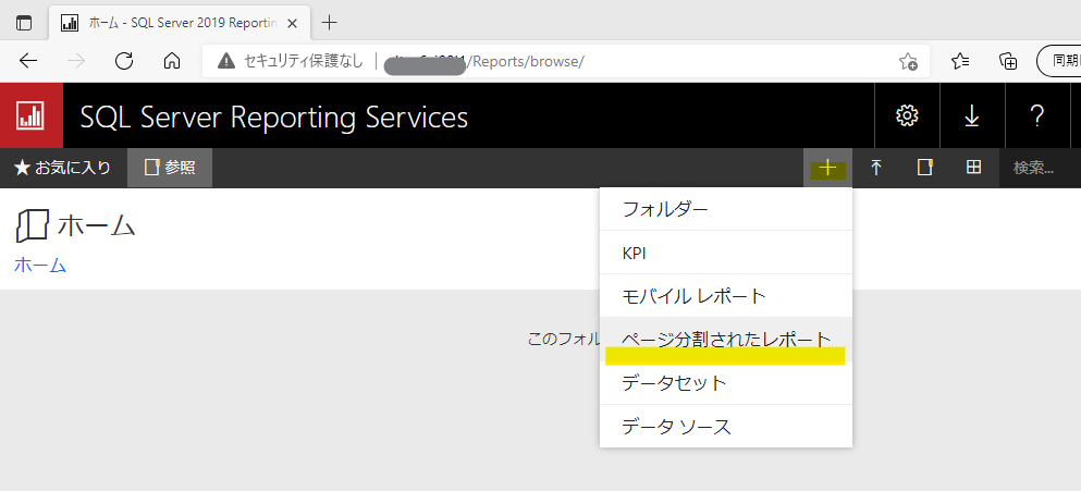 前回の最後に構成した Web ポータル URLより開始します。「+」メニューより「ページ分割されたレポート」を選択します。