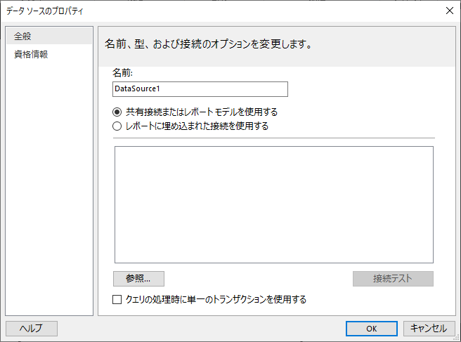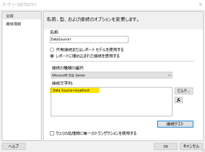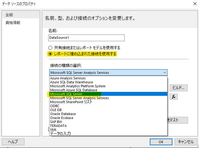 データソースは他のレポートと共有できますが、今回は最短距離ということで、このレポートに定義を埋め込みます。「レポートに埋め込まれた接続を使用する」を選択して「接続の種類の選択」では、SQL Server を選択してください。