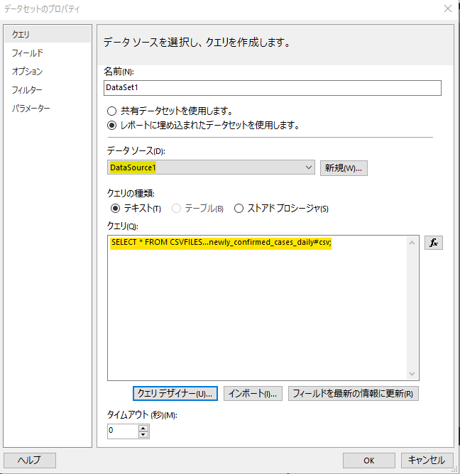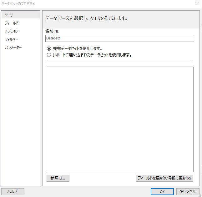 データセットもデータソースと同じく他のレポートと共有できますが、こちらもレポートに埋め込みとします。「レポートに埋め込まれたデータセットを使用」を選択します。