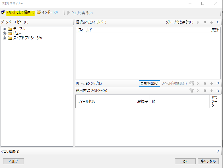 「データソース」には前項で作成したデータソースを選択し、「クエリデザイナー」を選択します。Access のようにテーブルを結合したり、色々できるデザイナーですが、ばっさりと省略し、「テキストで編集」を選択します。