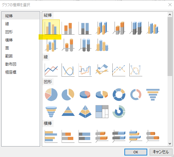 作成するのは、前回書いた「新規陽性者数の推移(日別)」のグラフです。これは縦の棒グラフなので、そちらを選択します。
