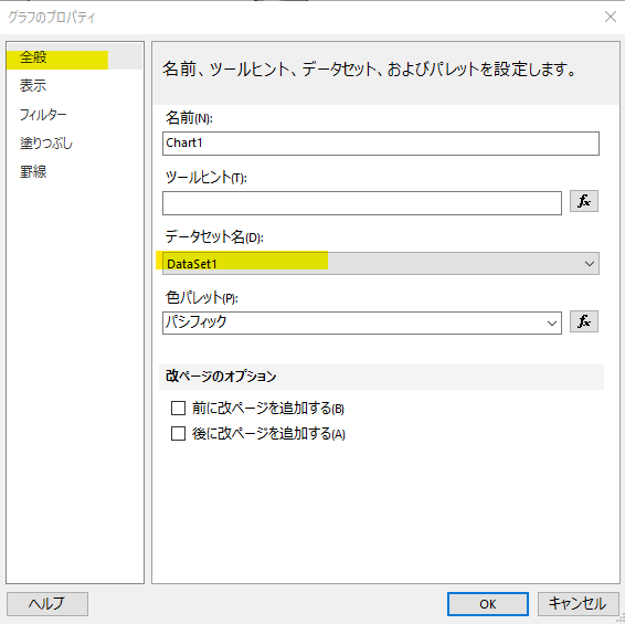 まず「全般」→「データセット名」にて前項で作成したデータセットを選択します。