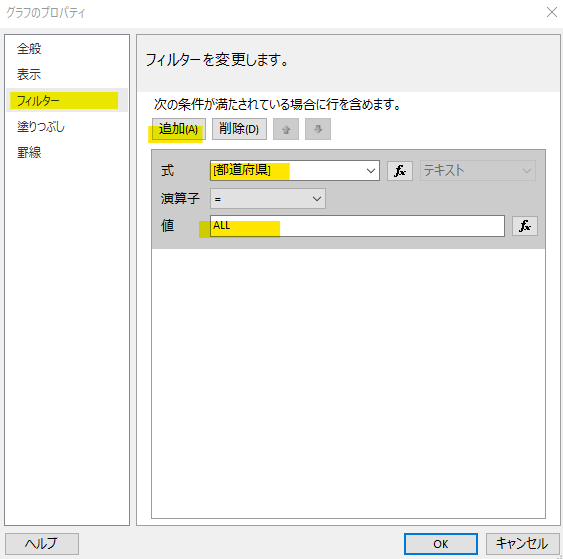 尚、データセットの中身を見てもらえばわかりますが数値は都道府県別です。次回以降でここは切り替えられるようにしますが、とりあえず全国(都道府県=ALL)を対象とします。この WHERE 句相当が「フィルター」設定です。以下のように絞り込み条件を設定しておきます。
