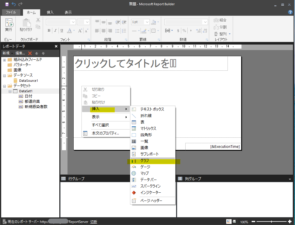 デザイナー上に表示されているのは白いキャンバスと同じで、こちらに色々と部品を貼り付けながら全体のレポートを作成していきます。今回は最短距離でグラフを作るので、レポート上で右クリック→「挿入」→「グラフ」を選択します。