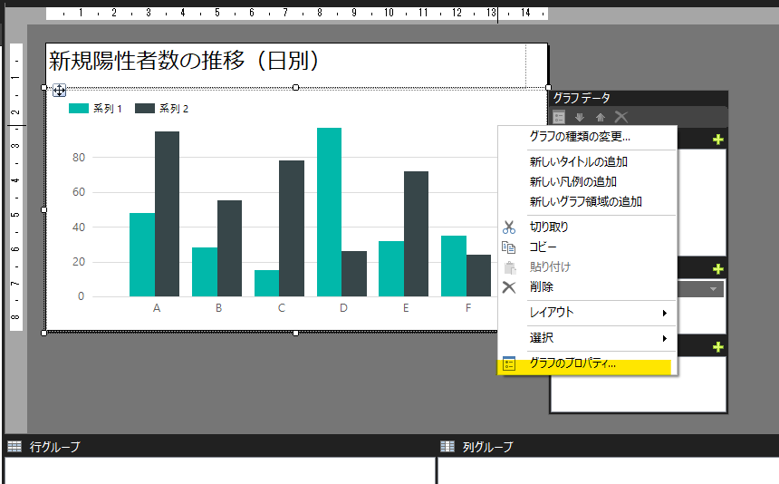 次に、グラフとデータセットの関連付けを行います。挿入したグラフを選択状態にして右クリック→グラフのプロパティを選択します 。