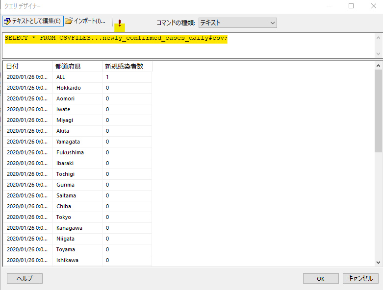 データが正しく取得できていれば、OKボタンで元画面に戻ります。最初から SQL がわかっていればクエリデザイナーは不要ですが、SQLが正しいかどうかを含めて確認できるので、クエリデザイナーはそれはそれで便利だと思います。