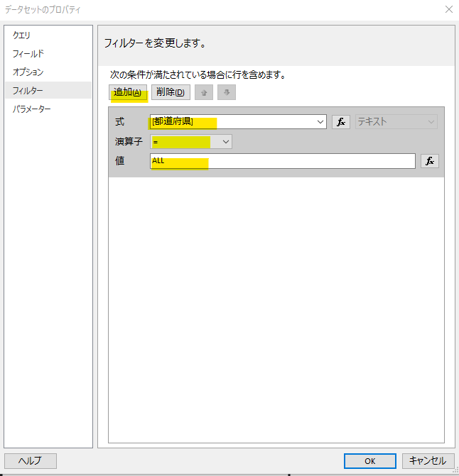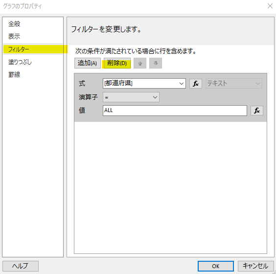 ということで、フィルターは「グラフデータ」で行うのではなく「データセット」で行うように修正します。これにより、このデータセットを利用するコントロールはすべて「当道府県」を意識する必要がなくなります。まず、グラフのプロパティのフィルターより、都道府県の条件を選択状態にして「削除」ボタンで削除します。