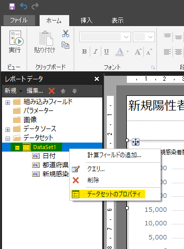 データセット(DataSet1)を選択し、右クリック→「データセットのプロパティ」を開きます。
