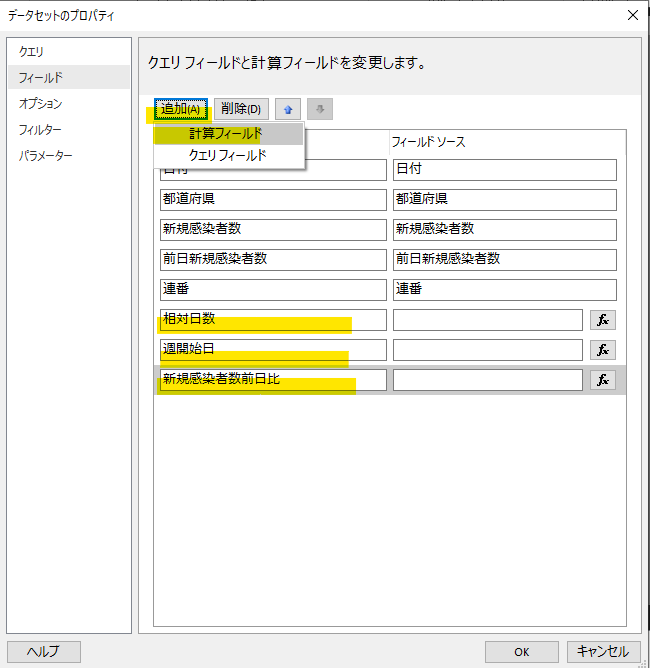 次に計算列を追加します。「追加」ボタンを押下して「相対日数」「週開始日」「新規感染者数前日比」を追加します。