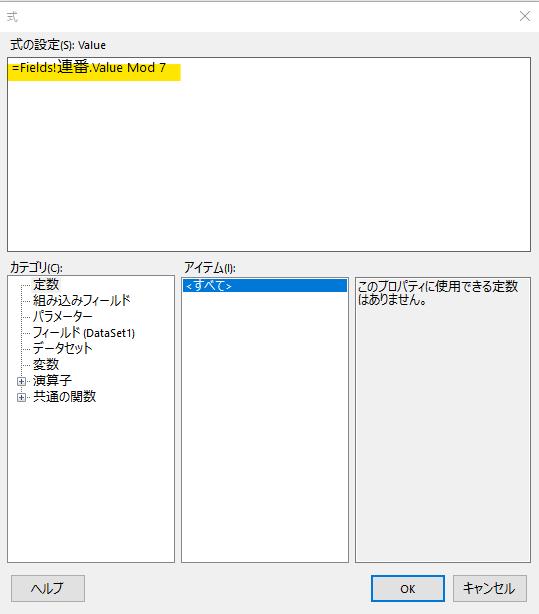 =Fields!連番.Value Mod 7