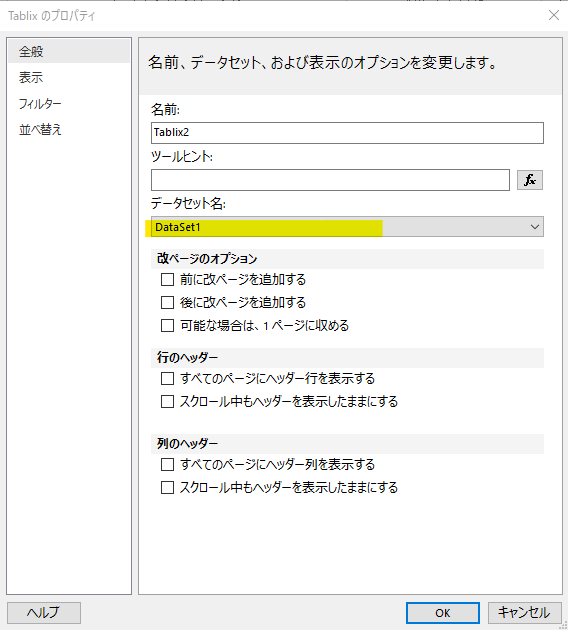 次に「Tablix のプロパティ」の「データセット名」でテストしたいデータセットを選択します。