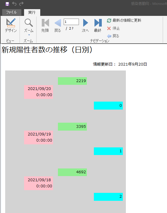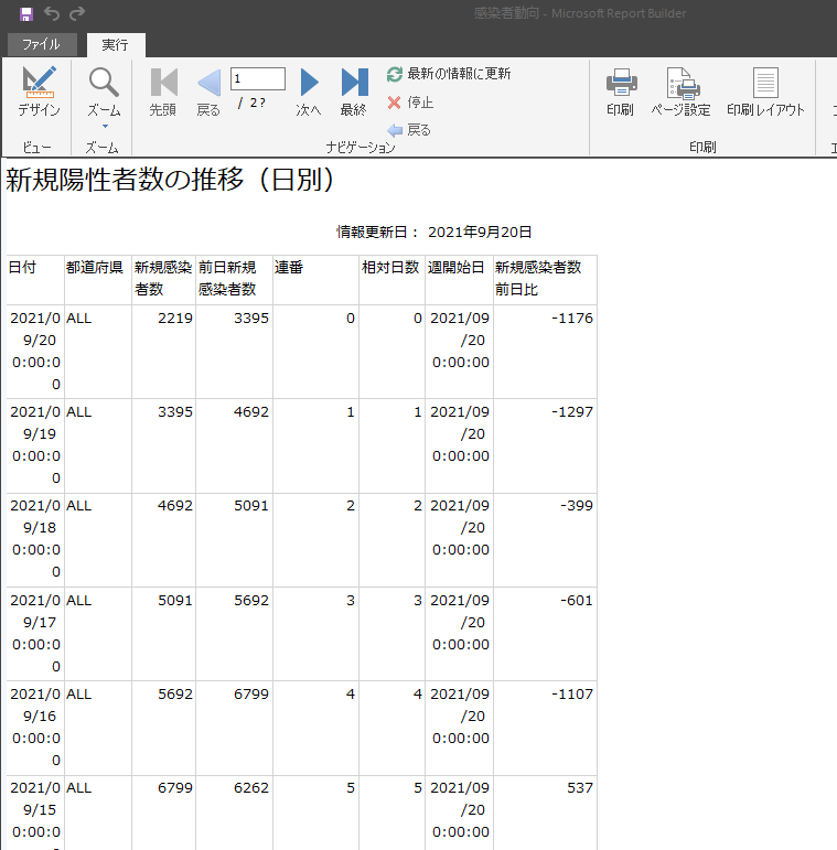 目標となるレポートは以下の通りで、今回は指標値(新規陽性者数、1週間平均、前週平均)を表示してみます。