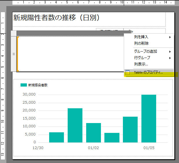 配置した「一覧」のサイズを少し広げて列部分を選択状態にして右クリック→「Tablix のプロパティ」を選択します。