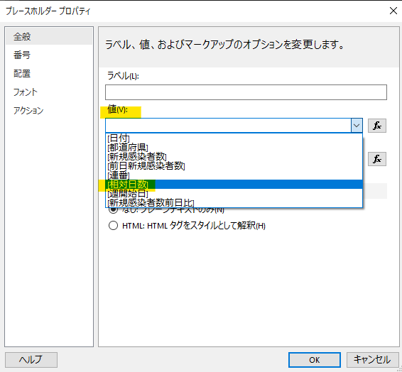 そうすると「表」の列でデータセットの項目が選択できるようになるので、全項目を設定していきます。表示「フォント」を変更しておかないと日本語の場合は文字化けしますのでご注意を。
