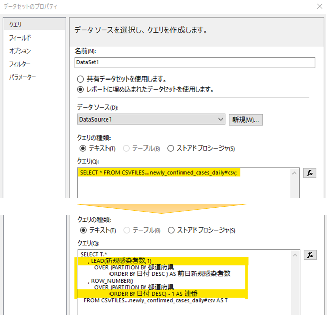 クエリ(SQL)そのものに列追加します。LEAD 関数を利用して、日付の降順で次のレコードにある「新規陽性者数」を取得するようにします。