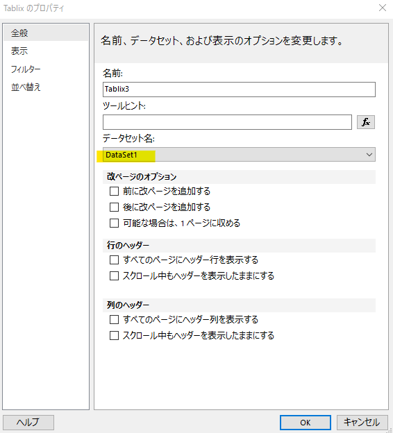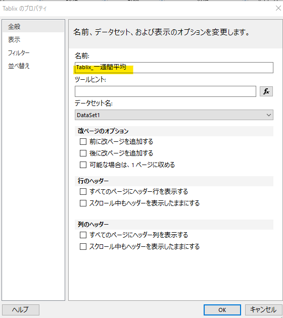 また Tablix のプロパティからの親となる「一覧」の名前も変更しておきます。
