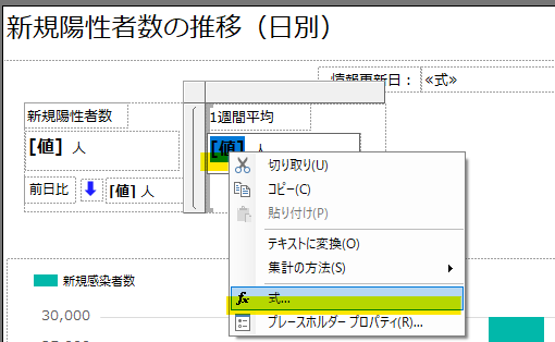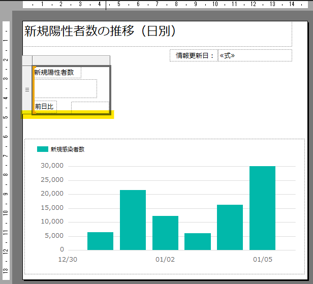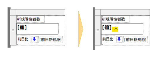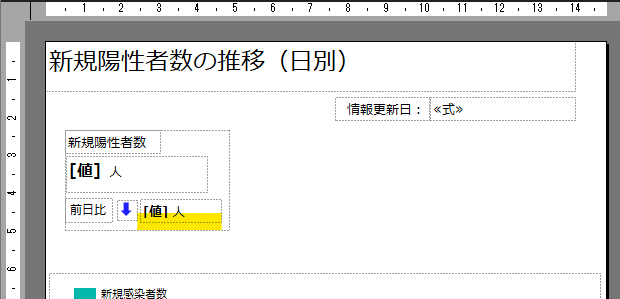 第4回で書いたように、ここの指標値は「一覧」配下に配置した「テキストボックス」で作っていきます。まず「新規陽性者数」のラベル等をテキストボックスで作成します。