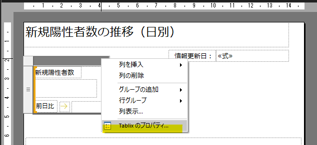 「一覧」とデータセットを紐づけします。親になっている「一覧」を選択して右クリック→「Tablix のプロパティ」を選択します。