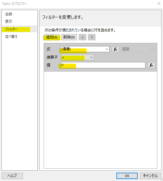 この項目は「第1週」を表示するわけなので、フィルターを設定します。グループプロパティのフィルターであることに注意してください。「新規陽性者数」のときのように「Tablix(一覧)のプロパティ」ではありません。Tablix のプロパティでは、グループ集計される前の値に対するフィルターなので値が欠落してしまいます。