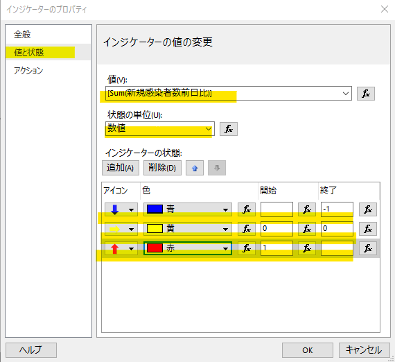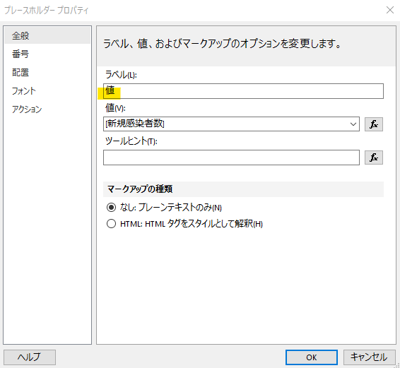 新規陽性者数のテキストボックスでは「新規感染者数」を選択し、前日比のテキストボックスでは「前日新規感染者数」を選択します。例によって日本語はデフォルトフォントで文字化けするので変更します。