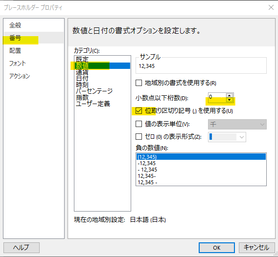 数値は、位取りのコンマを入れた整数表記にします。