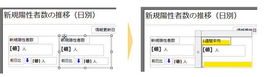「一週間平均」関連ラベルも「新規陽性者数」関連ラベルと見た目は似ていますので、オブジェクトをコピー&ペーストしてから作成します。親となる「一覧」を選択状態にしてコピー(Ctrl+C)、そのままペースト(Ctrl+V)で同じセットができますので、そこから「前日比」等を削除していきます。