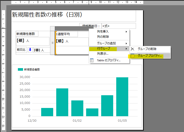 まずは、グルーピング項目を設定します。親となる「一覧」を選択した状態で右クリック→「行グループ」→「グループプロパティ」を選択します。