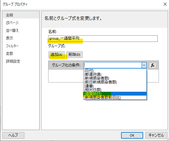 グループの名前を入力し、グループ式で「追加」ボタンから「週開始日」を選択します。第4回で週単位で集計するためにデータセットに追加した項目ですね。