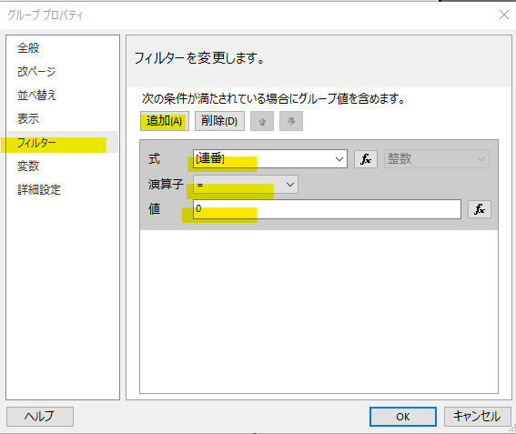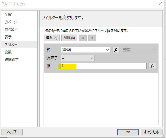 グループプロパティの「フィルター」を変更します。