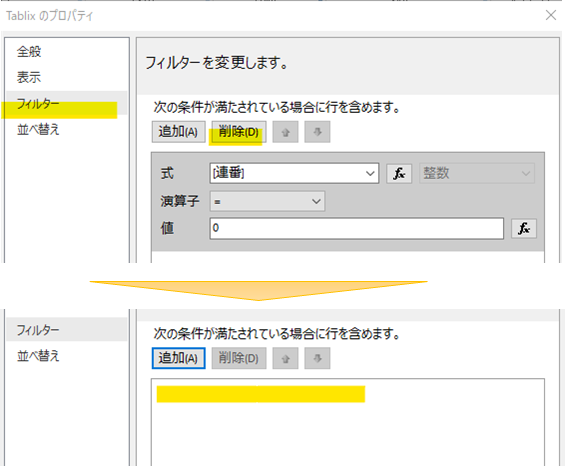 さらに「フィルター」からコピーされている条件は削除しておきます。これを忘れると後で値が合わなくて苦労します。(…苦労しました … 😅)